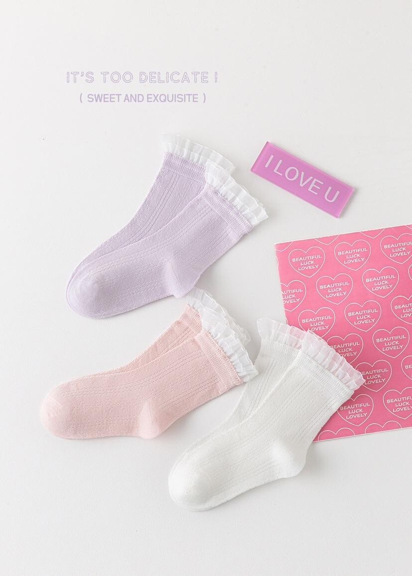 三款仙氣色系(紫 / 粉 / 白),加上輕盈抓皺的蛋糕花邊,根本是為小公主量身打造!👑