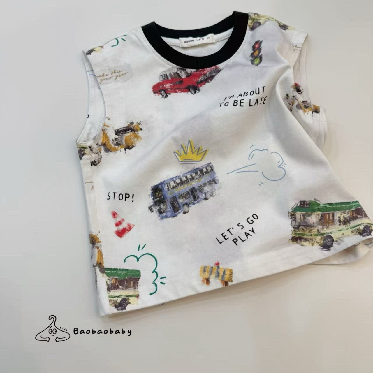 這件「奔跑吧!車車背心」集合了紅巴士、雙層公車、各種移動中的小車車,搭配塗鴉風格印花與俏皮英文字樣,讓寶貝一穿上就像踏上冒險旅程!