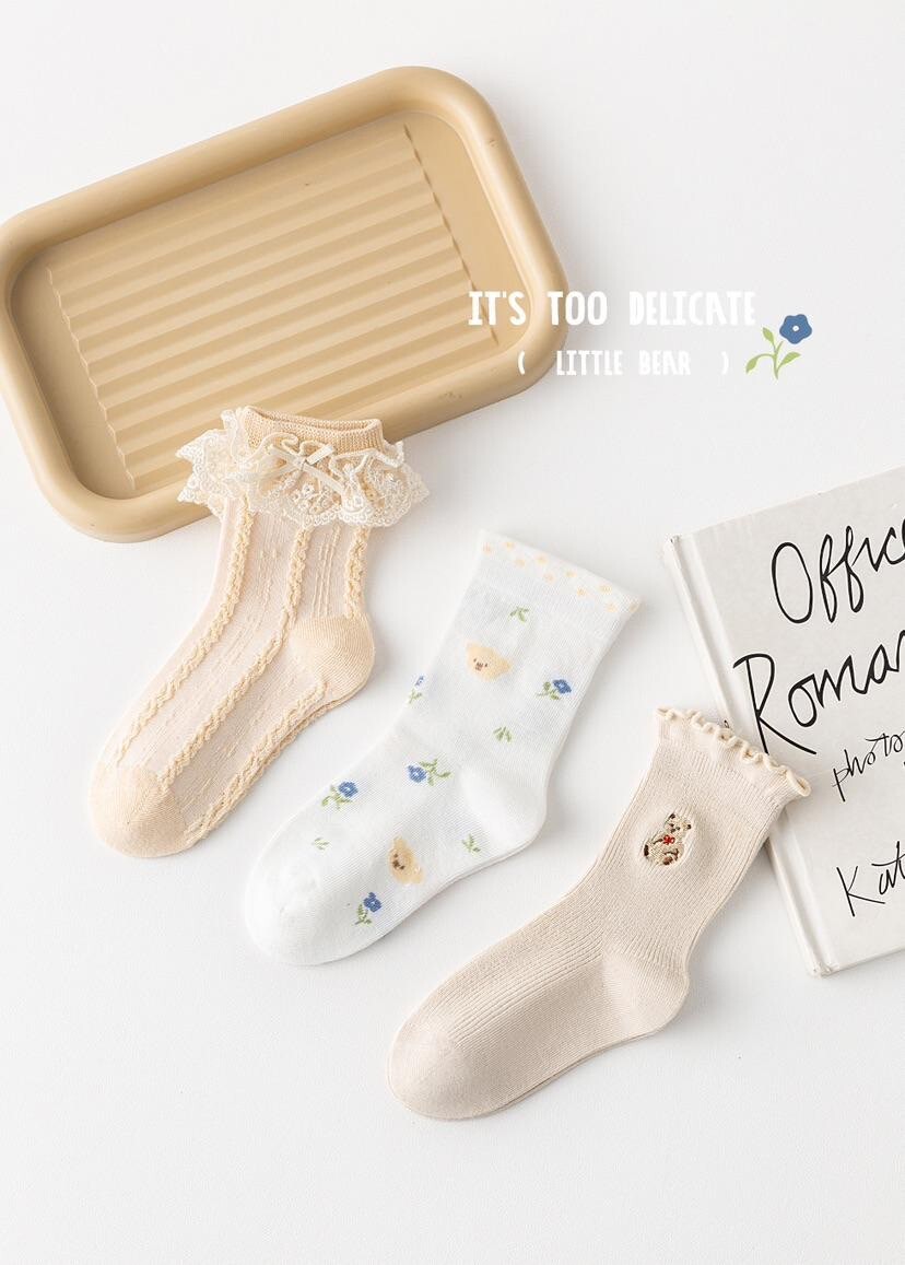 有蕾絲花邊款、繡花小熊款、還有可愛小熊配小藍花點點襪,三種風格一次滿足!