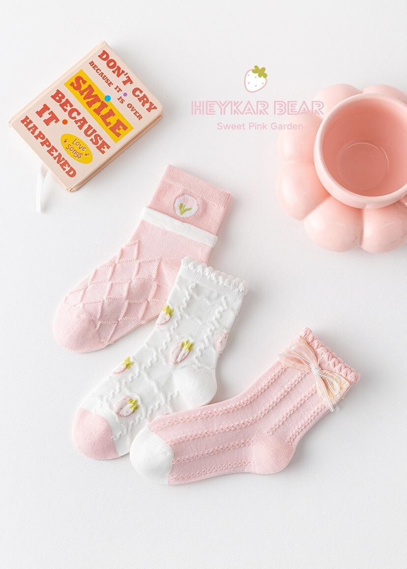 三款小巧精緻的設計,包含立體小草莓、格紋愛心與蝴蝶結蕾絲邊,每一雙都充滿童趣與甜味感!